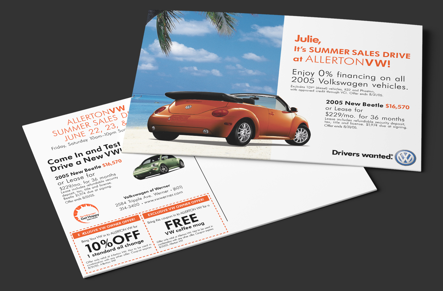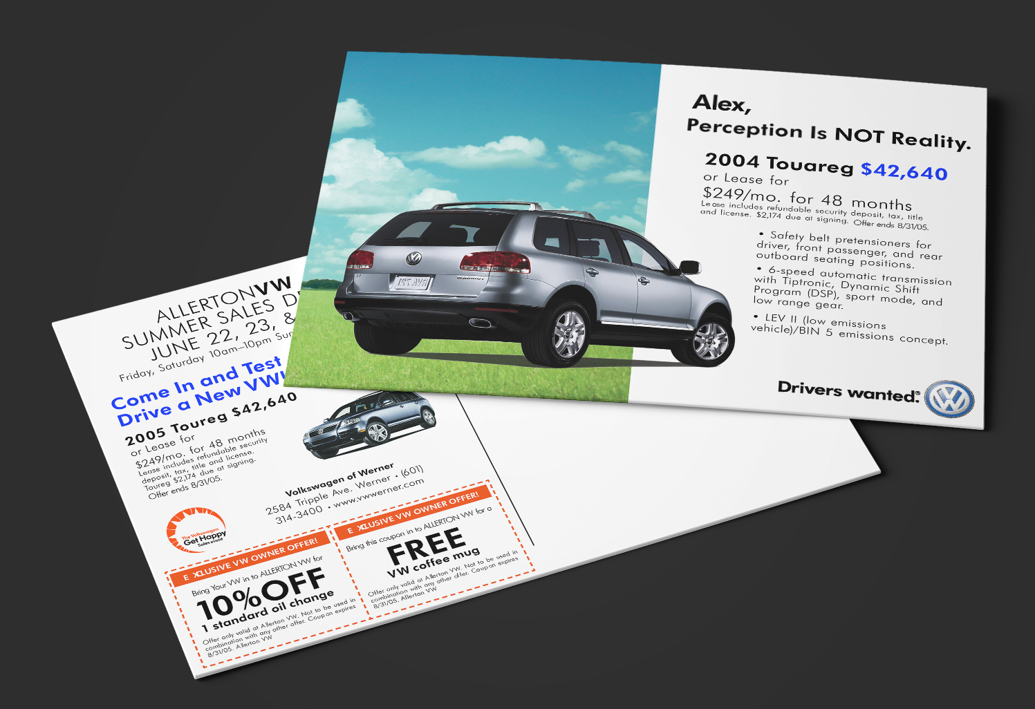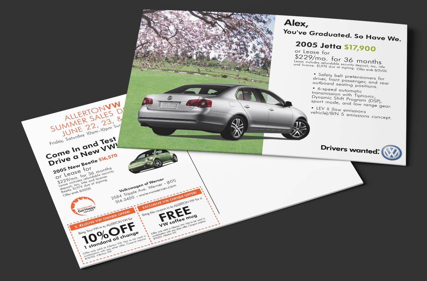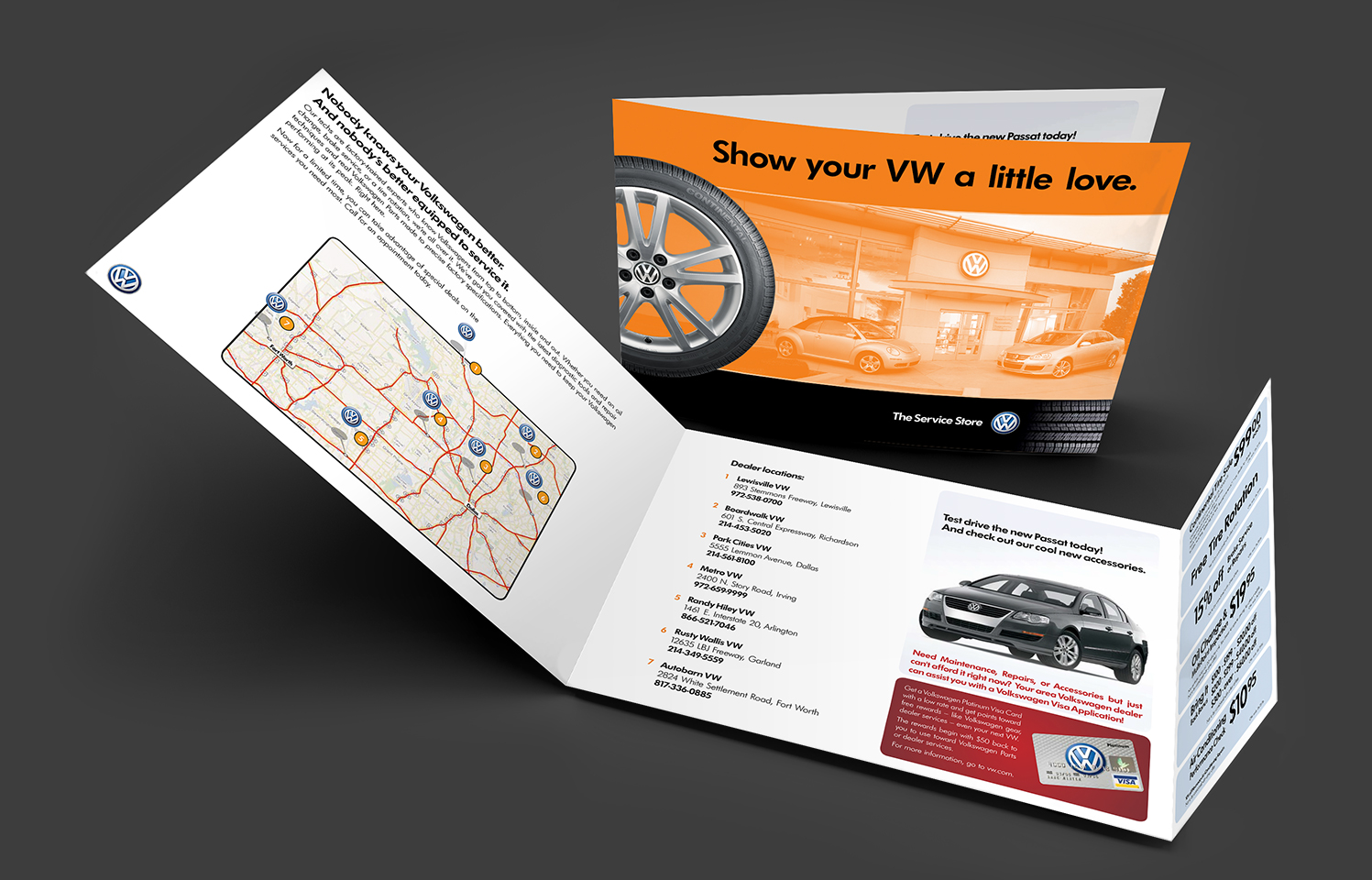 While working at Shared Marketing Services I was tasked to create direct mail and poster designs for Volkswagen dealers and service departments. The print designs used approved copy and imagery and followed brand guidelines.